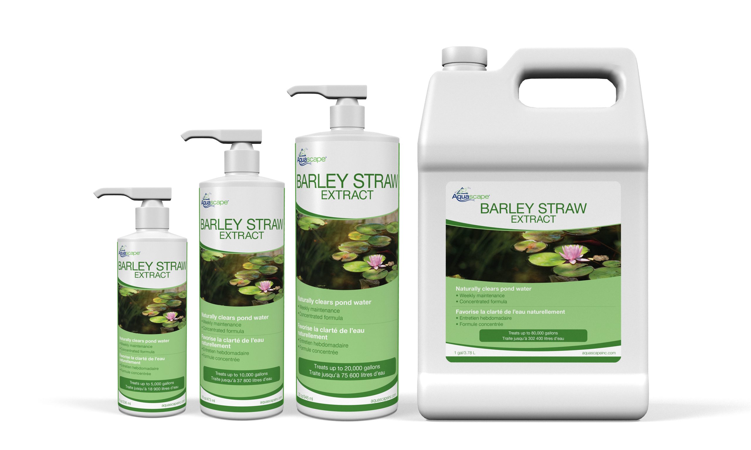 Aquascape Barley Straw Extract provides a natural method of clarifying pond water. Barley straw has been used for hundreds of years to promote clean and clear water conditions in ponds and streams. Now, you too can take advantage of this natural method without the hassle of dealing with barley straw bales, a typically messy process. Aquascape Barley Straw Extract starts working instantly and the concentrated formulation contains added enzymes to help break down sludge and clean filter pads, significantly reducing maintenance. Our Barley Straw Extract is safe for fish, plants, pets, and wildlife. The easy-to-use pump top accurately measures 100 gallons of treatment per pump and one full bottle treats 5,000 gallons of water.