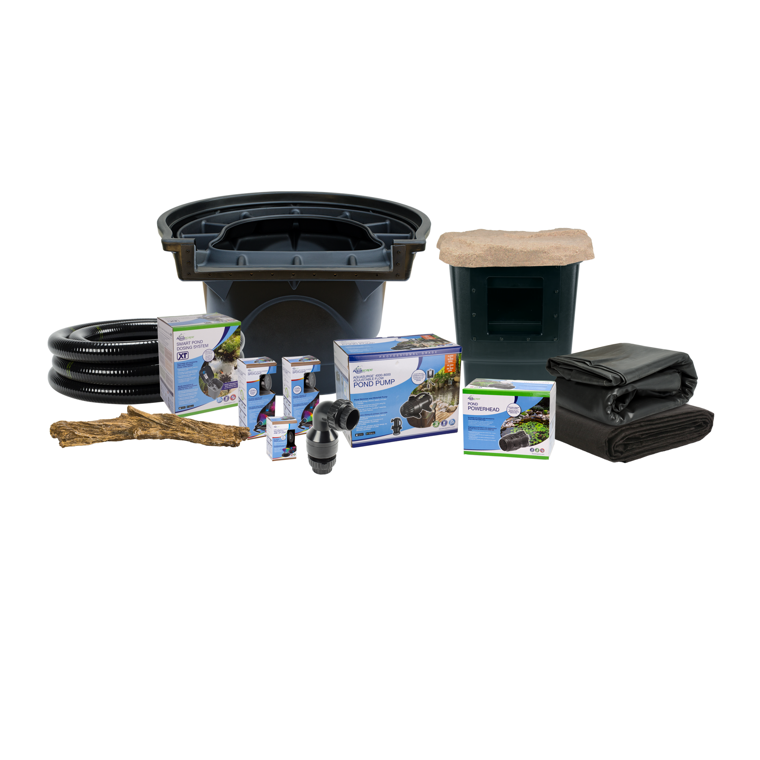 The Aquascape Large Deluxe Pond Kit 21′ X 26′ with AquaSurge 4000-8000 Adjustable Flow Pond Pump comes complete with everything you need to build a beautiful 21′ x 26′ ecosystem pond in any space, eliminating the guesswork and calculations when purchasing individual components. Aquascape Deluxe Pond Kits include all components found in professional grade pond kits but are enhanced with the addition of the Pond Powerhead, Faux Driftwood, and an LED color-changing lighting package. Connect the lights and pump to the Aquascape Smart Control App and control them with your smartphone or tablet. The complete kit includes a skimmer and BioFalls® filter to provide effective mechanical and biological filtration. An energy-efficient pump is included to provide ideal water flow. The Smart Pond Dosing System XT and a starter water treatment is included to automatically add water treatments to the pond, keeping water conditions clean and clear.