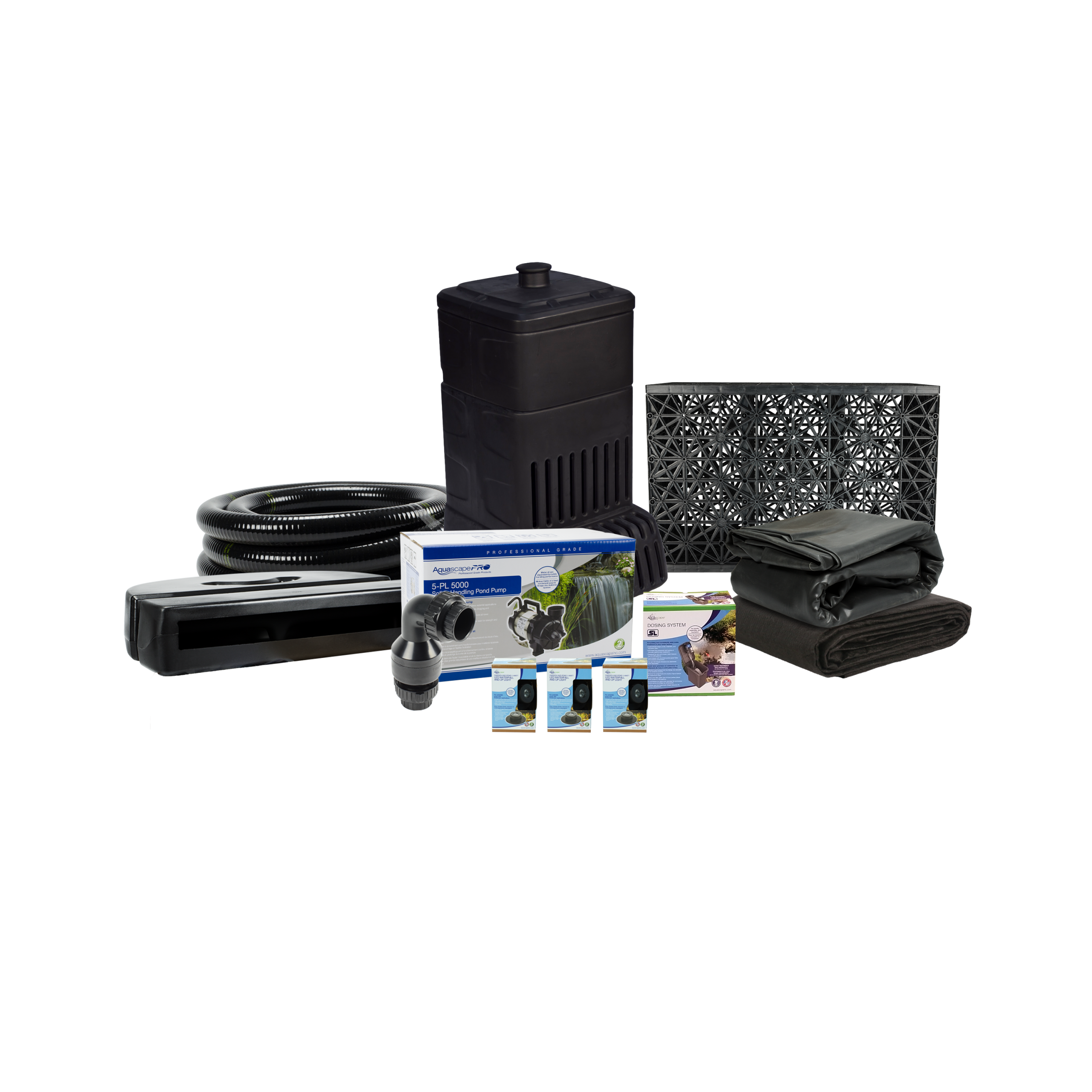 The Aquascape Large Pondless® Waterfall Kit 26′ Stream with 5-PL 5000 Solids-Handling Pond Pump comes complete with everything you need to build a beautiful, one-of-a-kind, recirculating 26’ waterfall and stream in any space, eliminating the guesswork and calculations when purchasing individual components. The complete kit includes a 22” wide waterfall spillway diffuser to optimize water flow and a pump vault for quick and easy pump access. A solids-handling 5-PL pond pump is included to provide ideal water flow and reduced pump maintenance. An LED lighting package is included to bring your pond to life at night. The Dosing System SL and a 32 oz. water treatment is included to automatically add water treatments to the waterfall, keeping water conditions clean and clear.