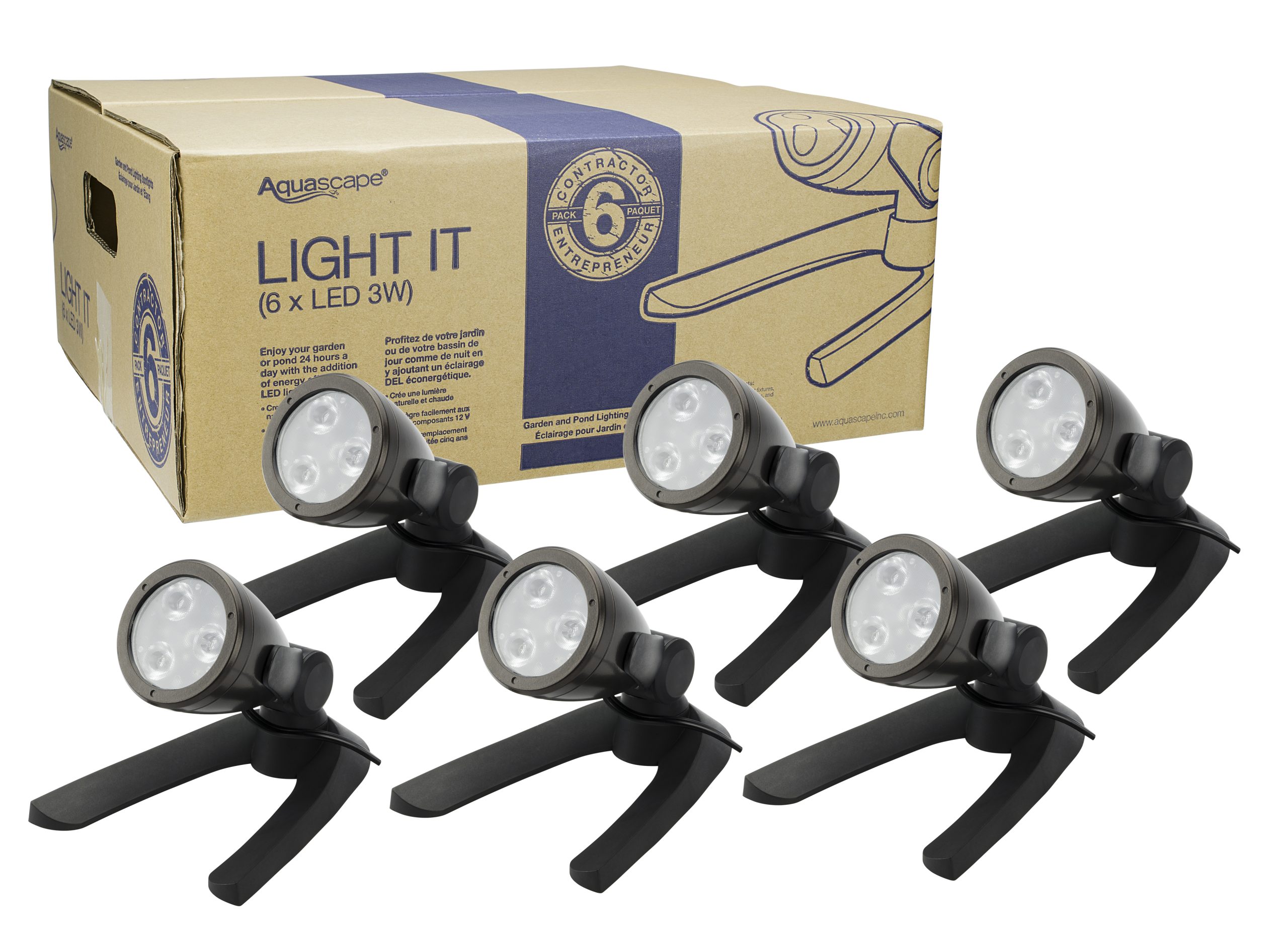 The Aquascape 3-Watt Spotlight 6-Pack is designed for quicker and easier installation of the Aquascape 3-Watt LED Spotlight. The pack includes 6 individual lights, and the specially designed box reduces packaging while taking up less space than individually purchased lights. Six-packs also save you money by providing six lights for the price of five. The kit is ideal for pond professionals and installations requiring multiple lights. The energy-efficient, compact lights can be placed anywhere a spotlight is needed, and they can be used either in or out of the water, transforming the way your water feature looks at night. Includes quick-connect fittings and removable mounting bases. Aquascape LED spotlights are completely sealed from water and come with a limited five-year full replacement warranty.